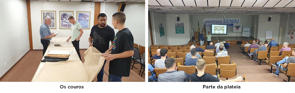 Palestrantes disponibilizaram vários couros que foram vistos, tocados e analisados pelos presentes.